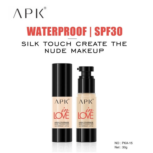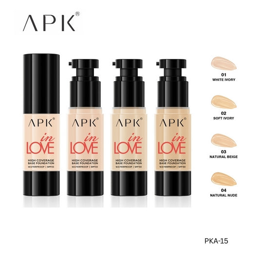APK High Coverage Waterproof Base Foundation SPF30 offers a natural, transparent finish while providing long-lasting coverage. Enriched with SPF 30, it protects your skin from harmful UV rays. Its waterproof formula ensures a flawless look even in humid conditions, while the silk touch texture creates a smooth, nude makeup effect. Available in four versatile shades—White Ivory, Soft Ivory, Natural Beige, and Natural Nude—to perfectly match your skin tone. This foundation effectively covers pores and imperfections for a natural matte appearance that lasts all day.